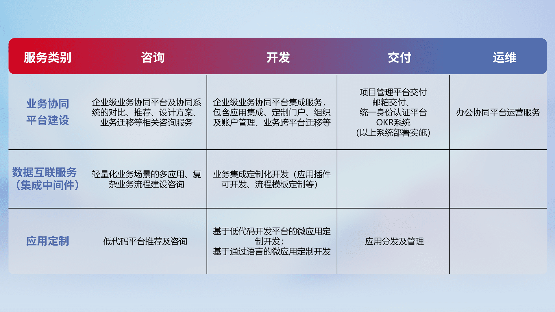 针对钉钉、、、企微、、、、IDaas等平台级产品提供产品的规划、、、方案、、交付、、、定制化开发等服务,,,实现如统一协同办公、、、智能客户服务、、混合会议管理、、智能数据查询、、等业务场景,,实现数字化转型。。。
